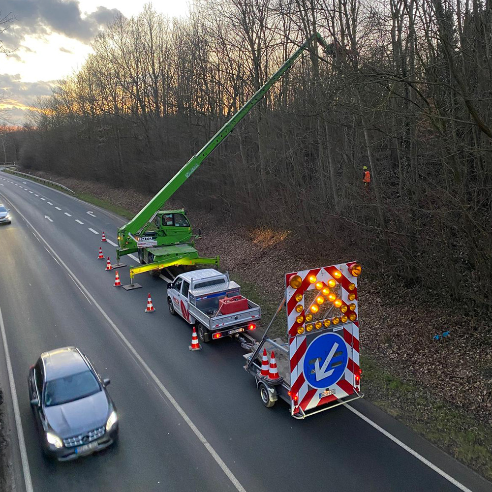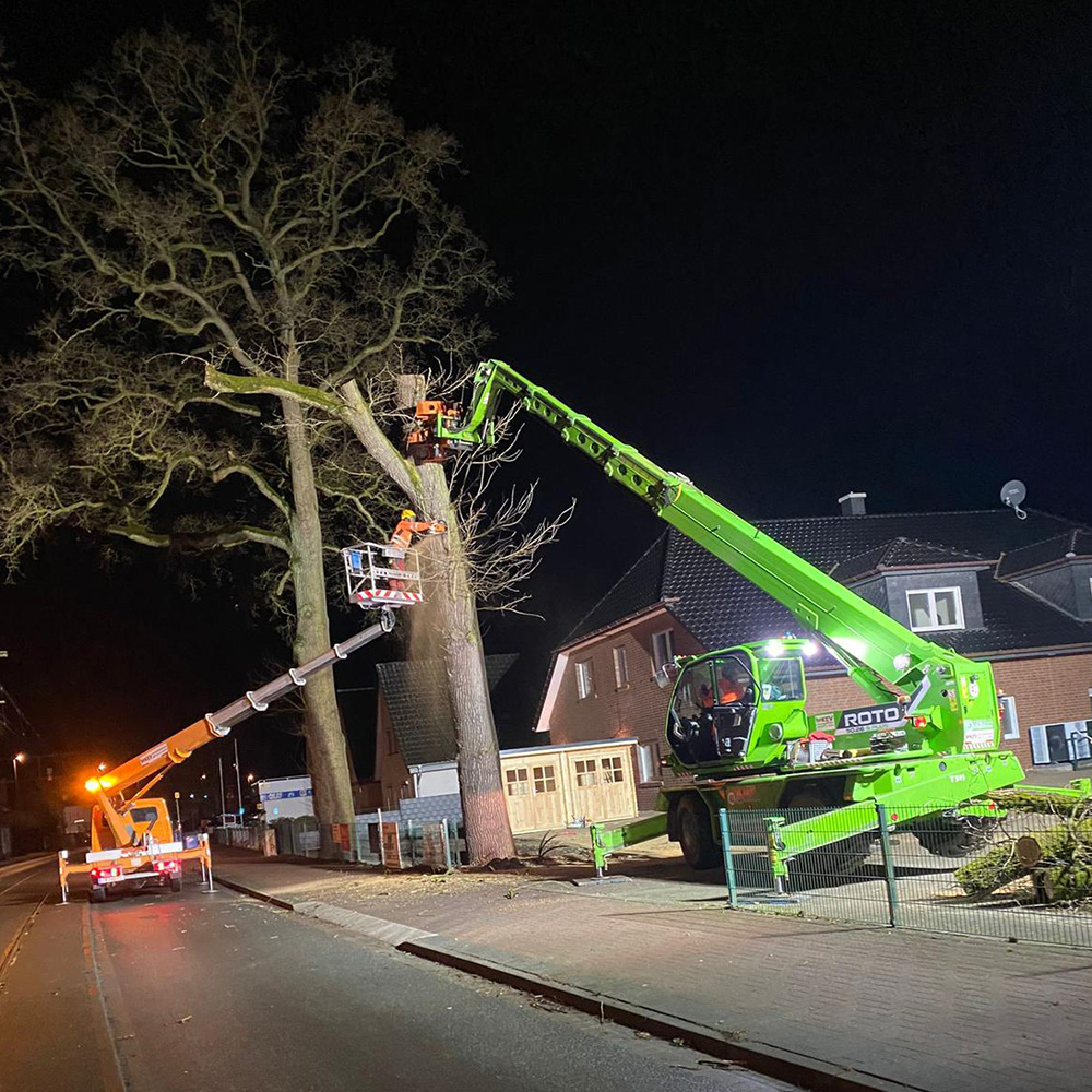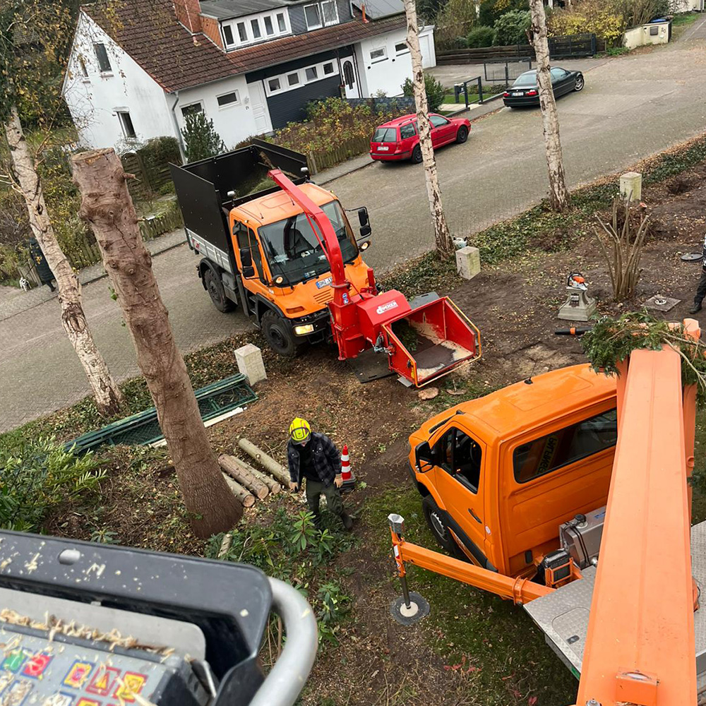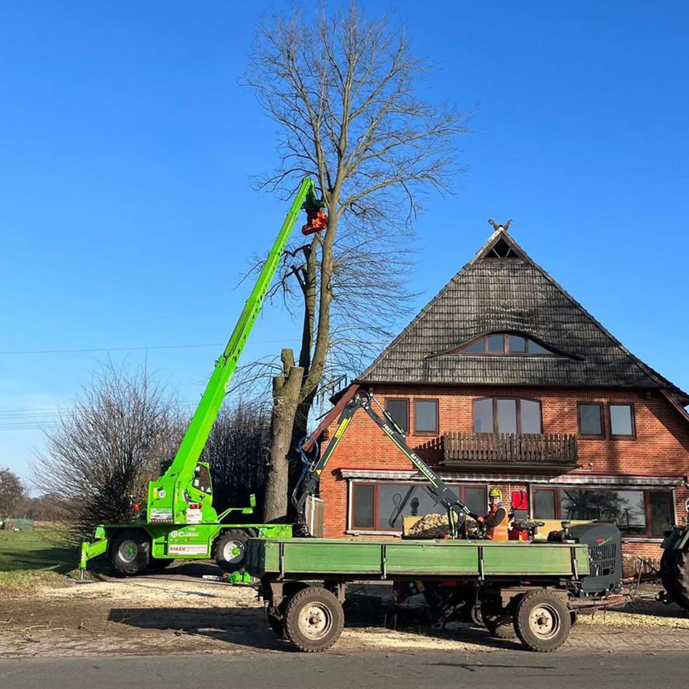 Für unsere Baumarbeiten steht ein moderner Fällkran mit 26 Metern Reichweite sowie eine Arbeitsbühne zur Verfügung. Zusätzlich bieten wir professionelle Seilklettertechnik (SKT) für schwer zugängliche Bereiche an.