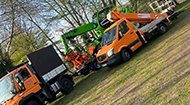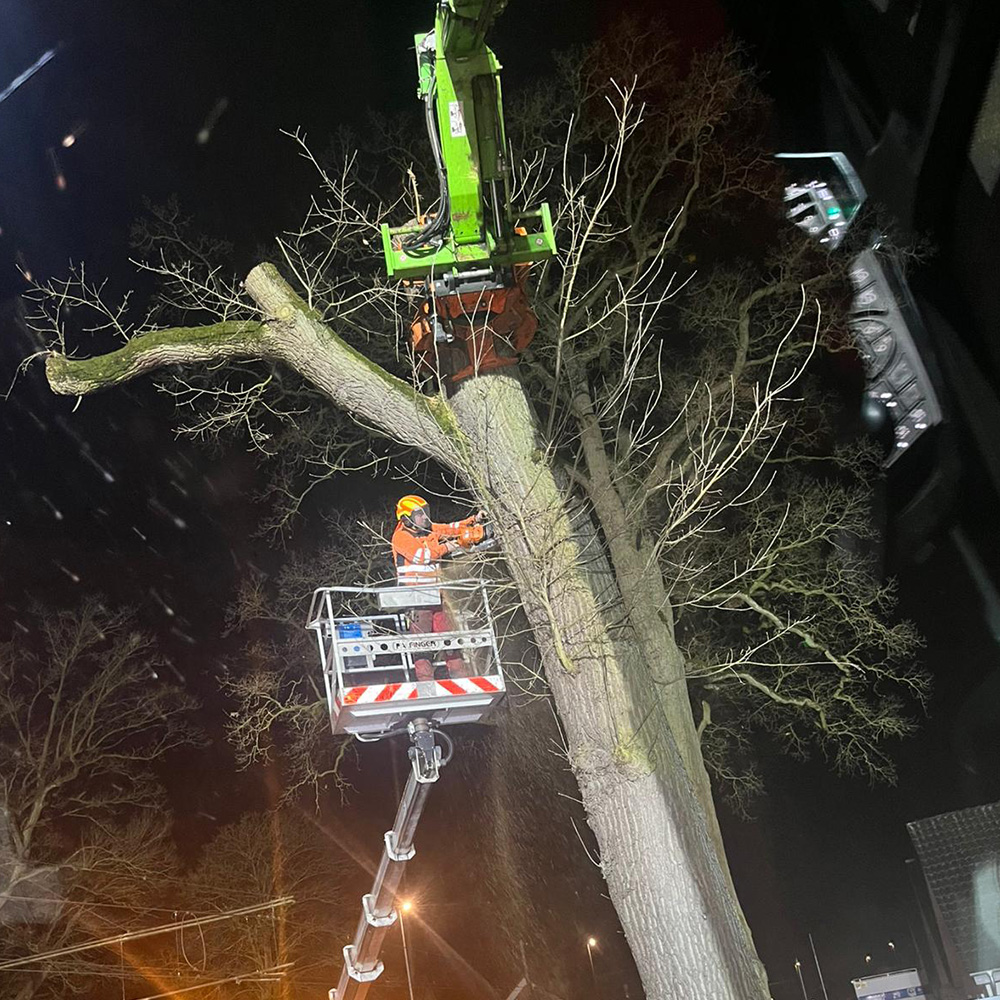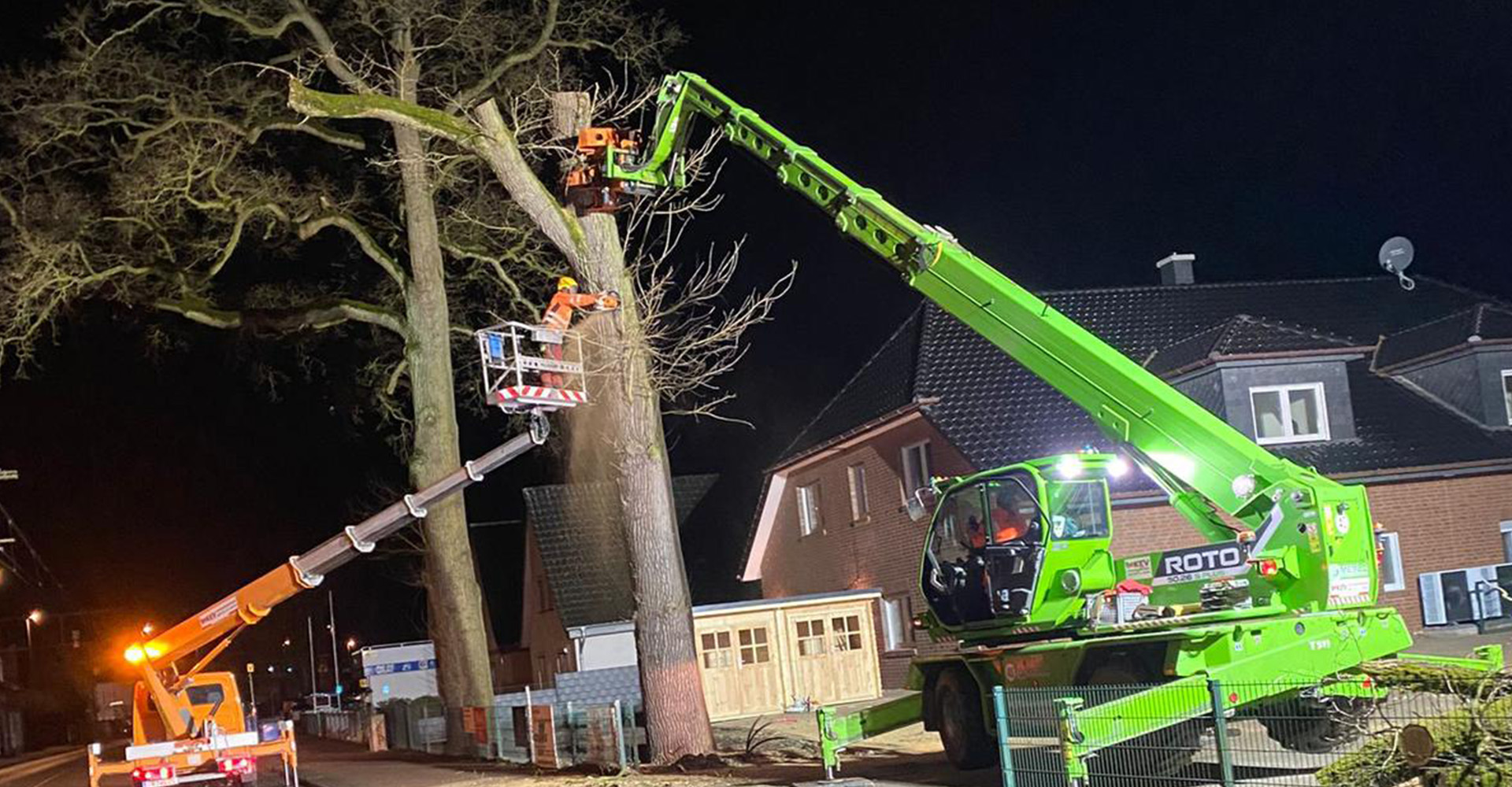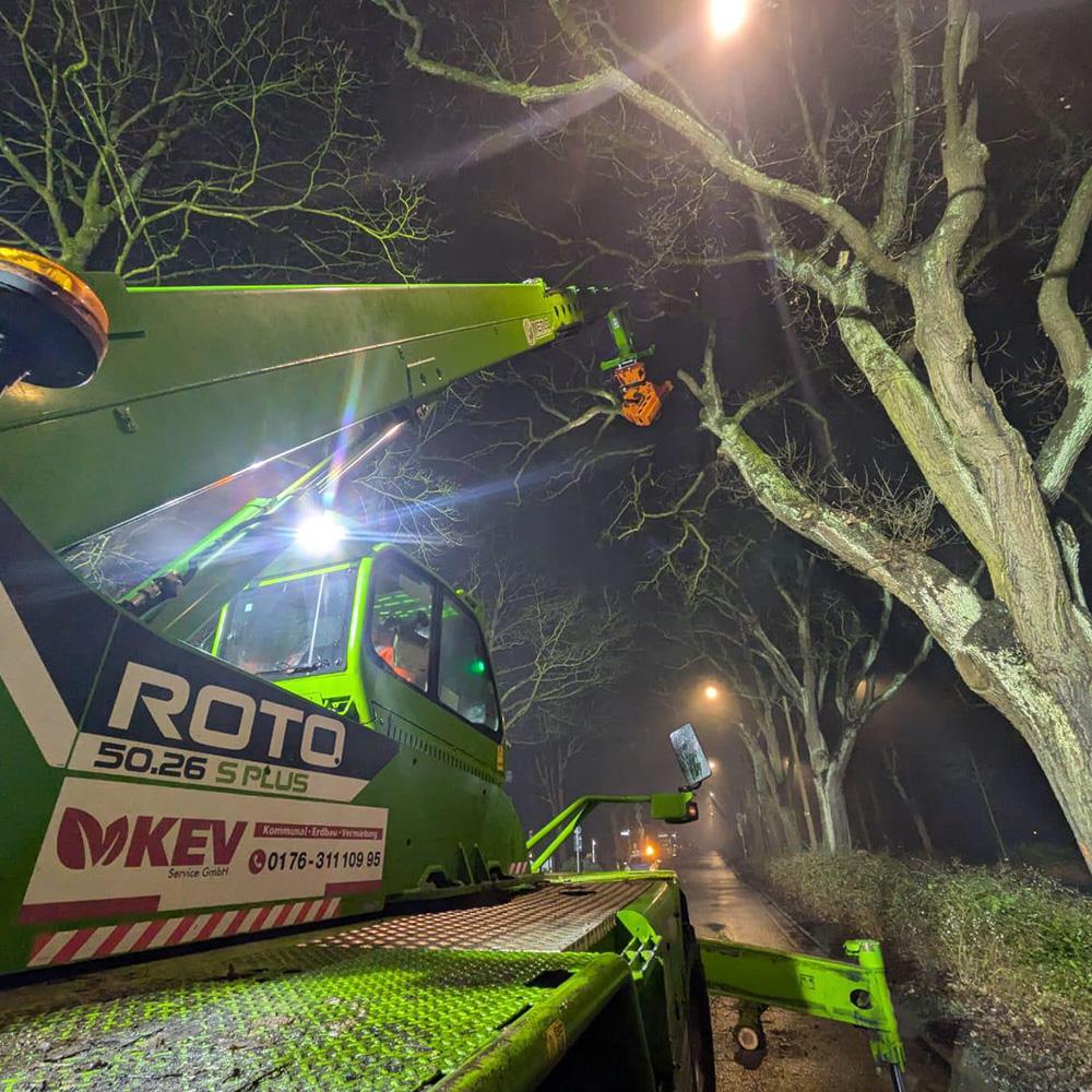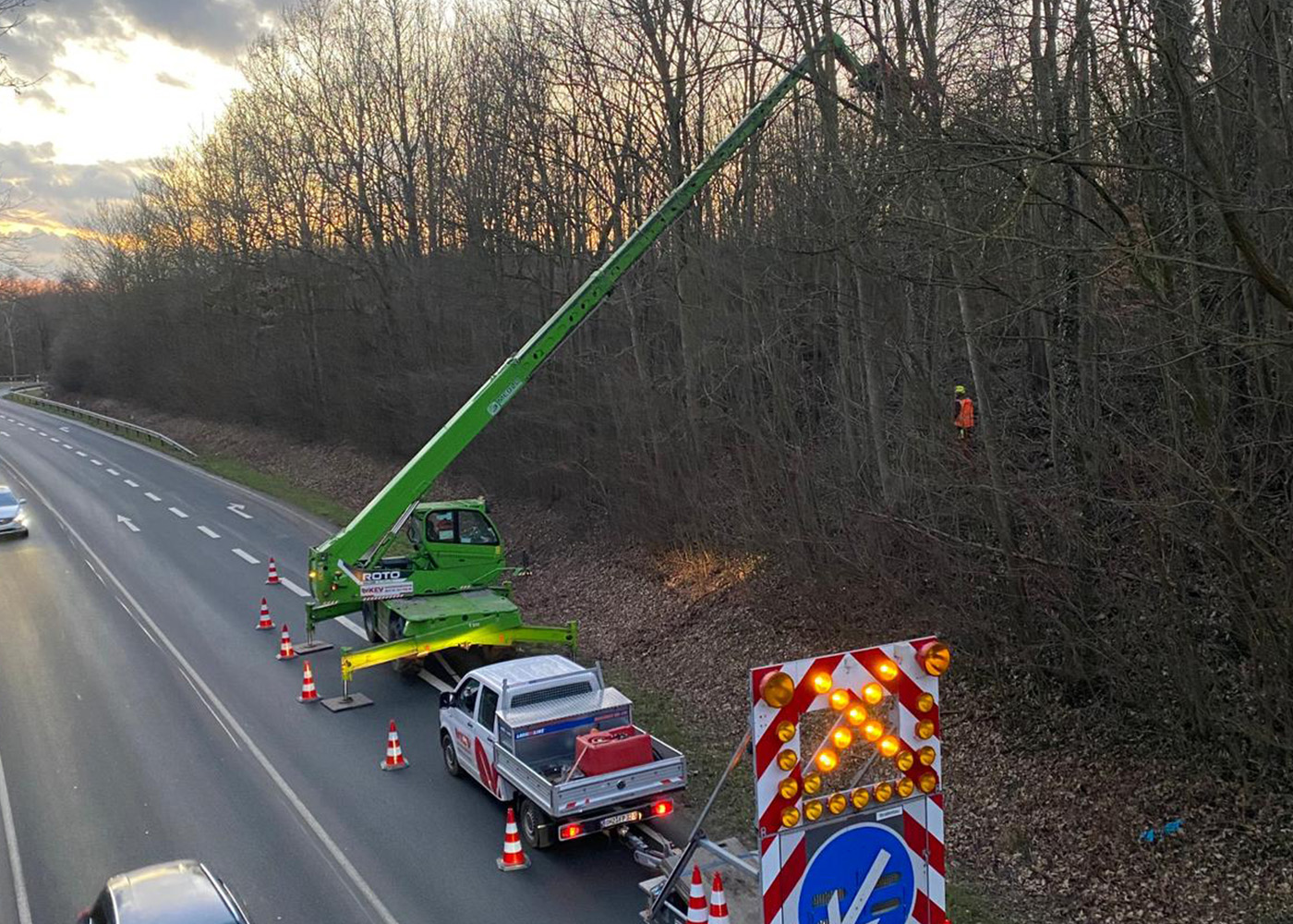Für unsere Baumarbeiten steht ein moderner Fällkran mit 26 Metern Reichweite sowie eine Arbeitsbühne zur Verfügung. Zusätzlich bieten wir professionelle Seilklettertechnik (SKT) für schwer zugängliche Bereiche an.