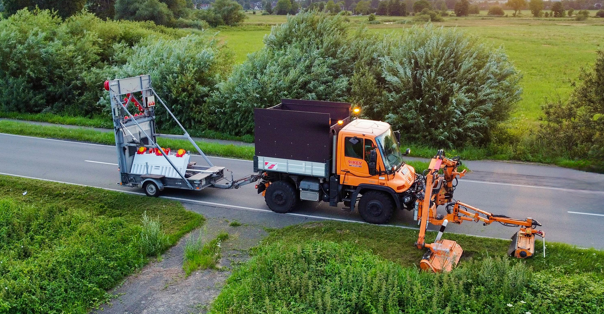 Böschungsmulcher am Unimog DUA 700 für effiziente Pflege von Böschungen und schwer zugänglichen Flächen.
