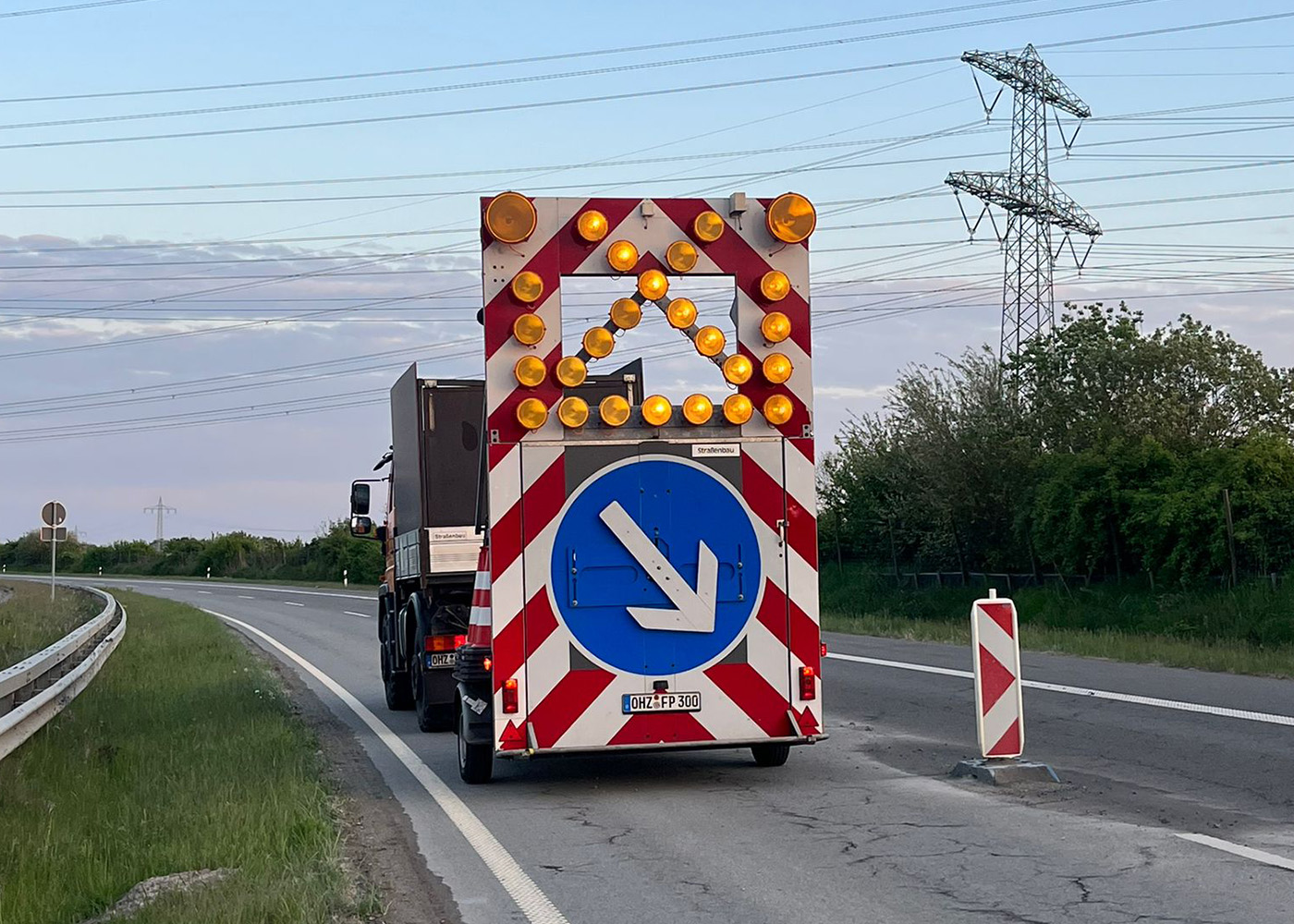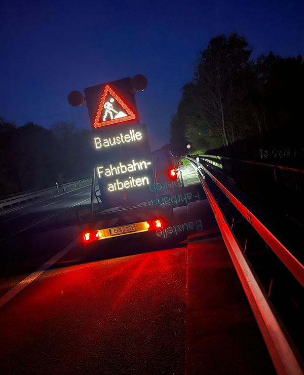 Verkehrssicherung von Arbeits- und Unfallstellen nach RSA 21 – auf Autobahnen und allen Verkehrsflächen. Ausgestattet mit Absperrtafeln 616 inklusive Funkwarneinrichtung sowie LED-Vorwarntafeln für optimale Sichtbarkeit und Sicherheit.